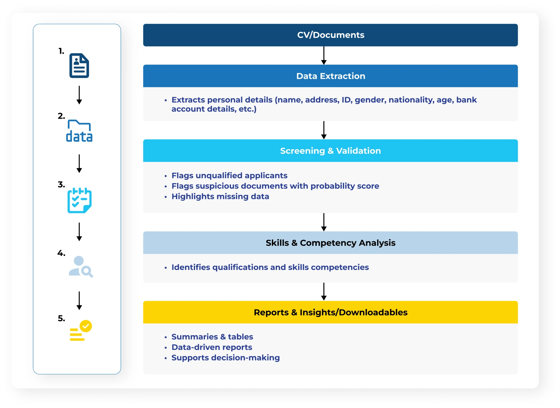 ai.HumanCapital™ key capabilities include AI-powered CV parsing and data extraction, skills and competency analysis, job matching with percentage scores and skill gap identification, as well as gap analysis to recommend training needs.